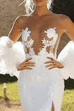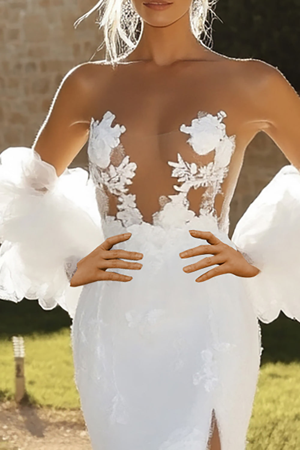 Ivory Mermaid Lace Tulle Half Sleeves Wedding Dress with Slit