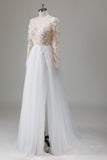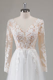 Ivory V Neck Beaded Applique Long Wedding Dress with Illusion Sleeves