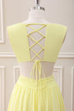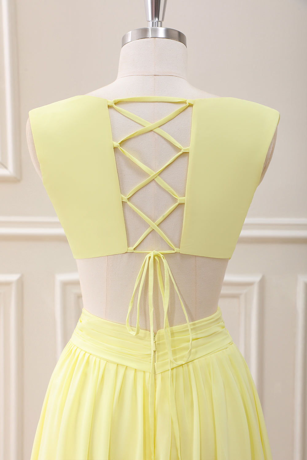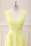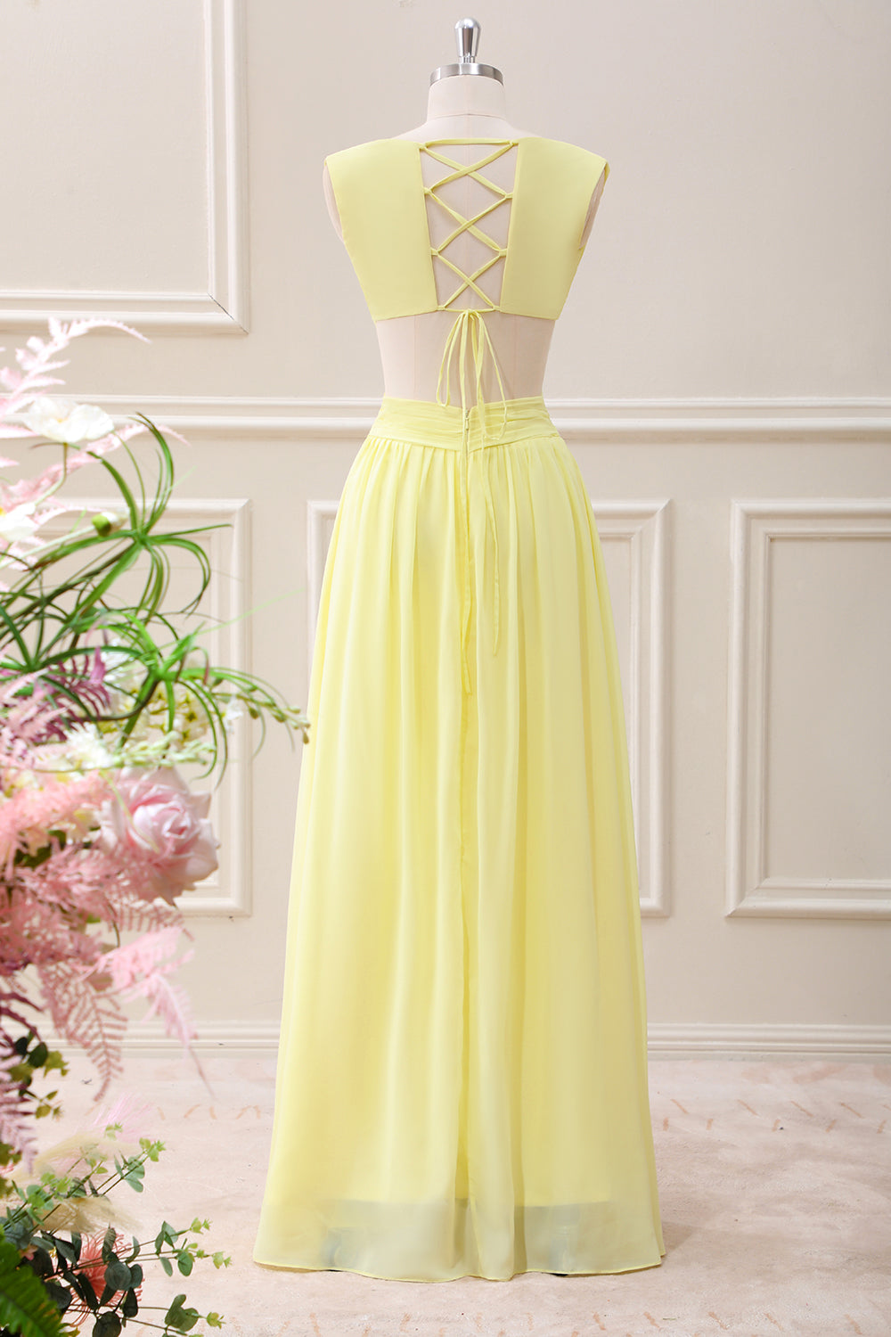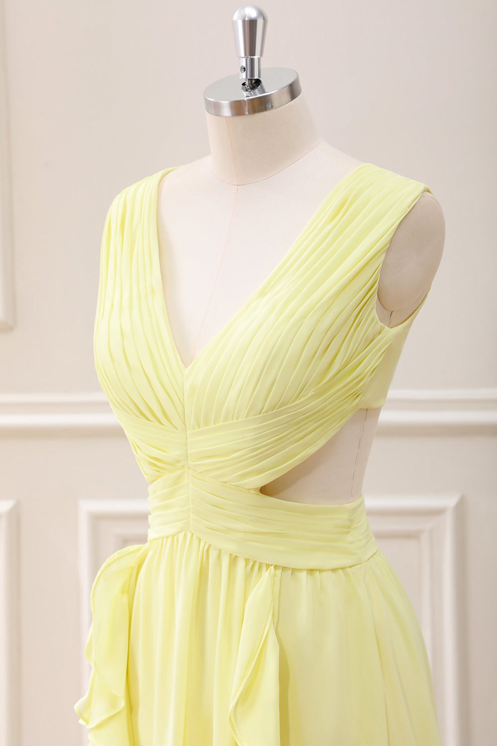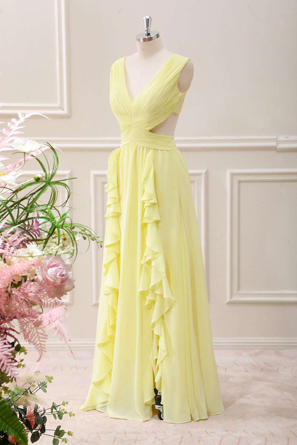 Lemon Yellow V Neck Cut Out Chiffon Maxi Dress with Ruffles