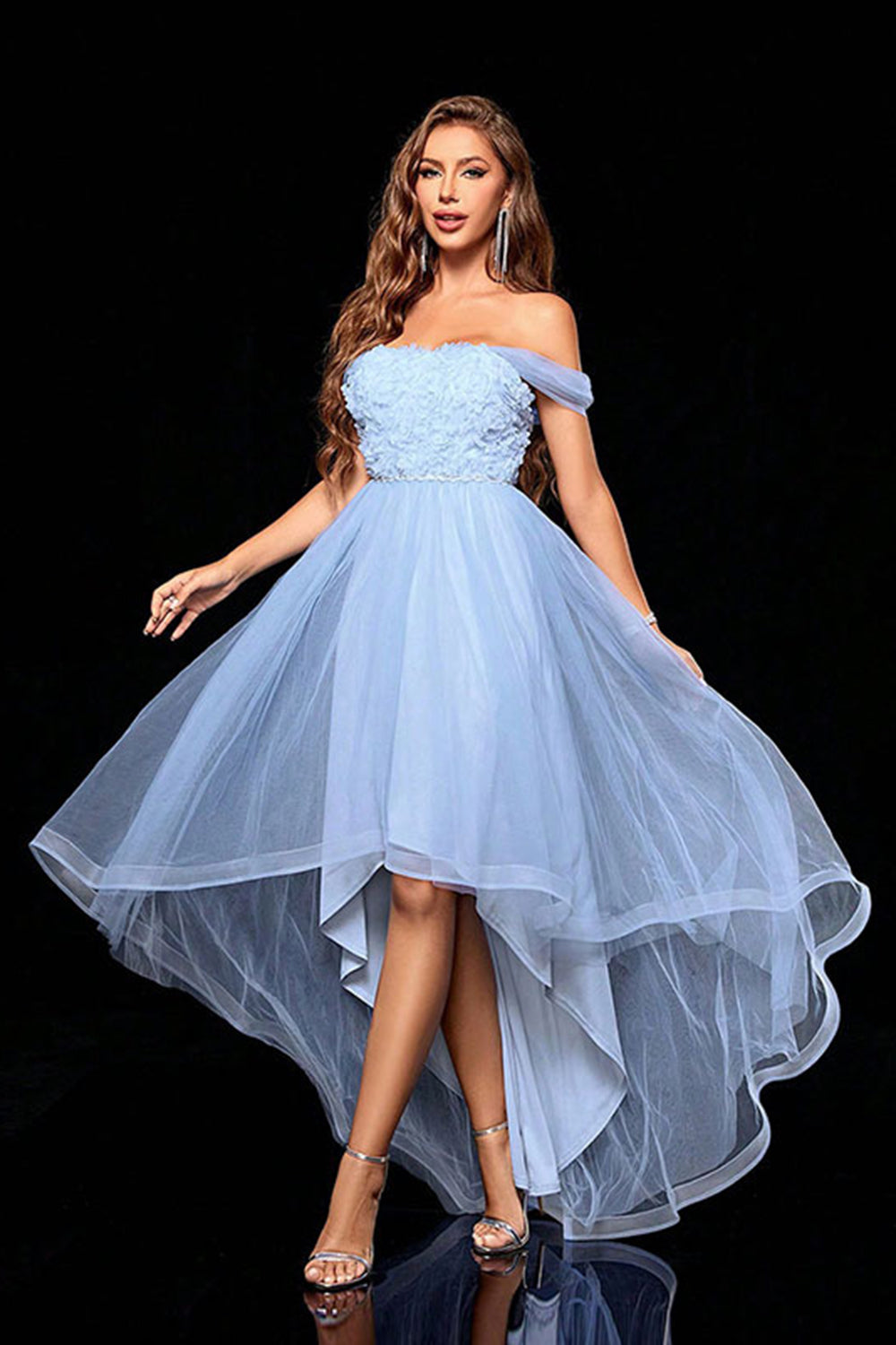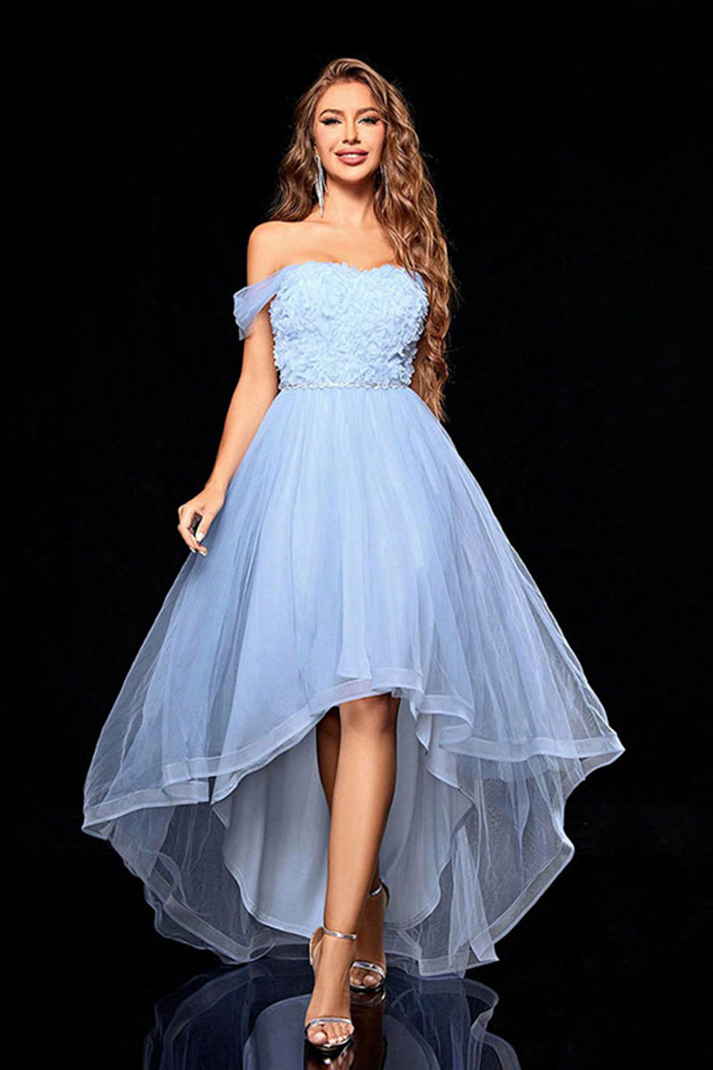 Light Blue Tulle A Line Off the Shoulder Appliques Maxi Dress