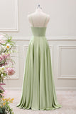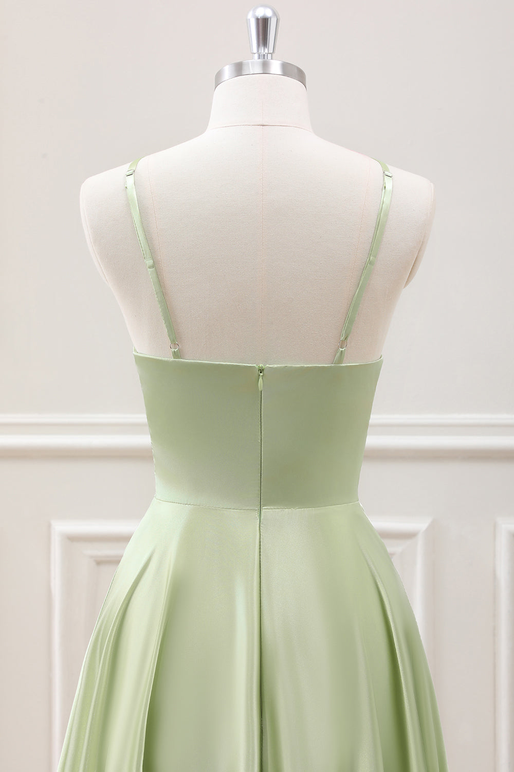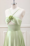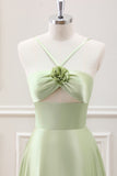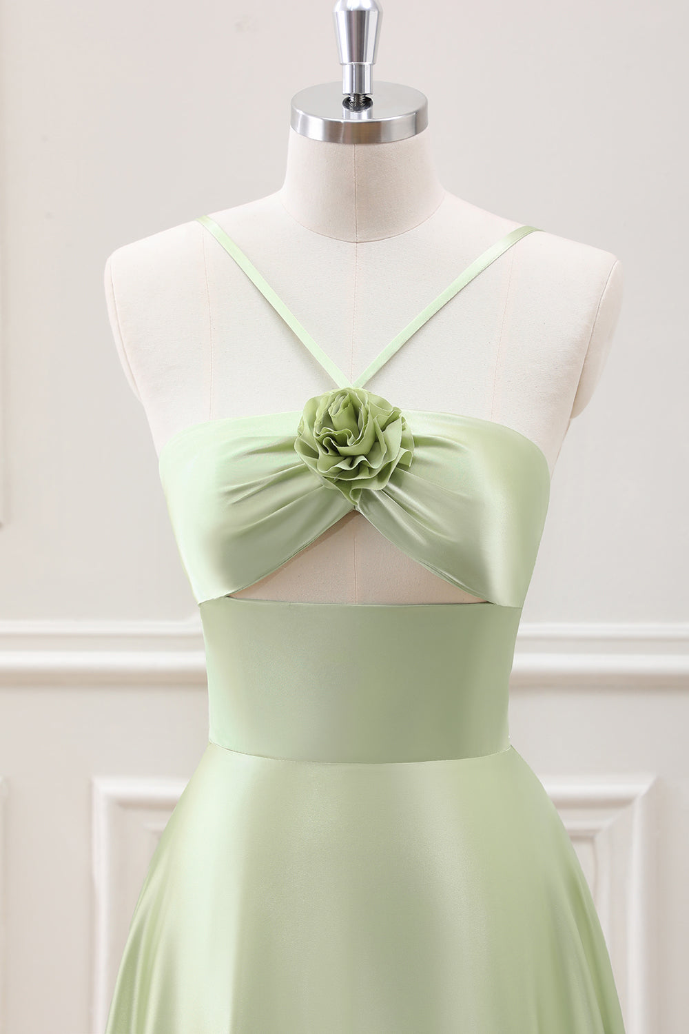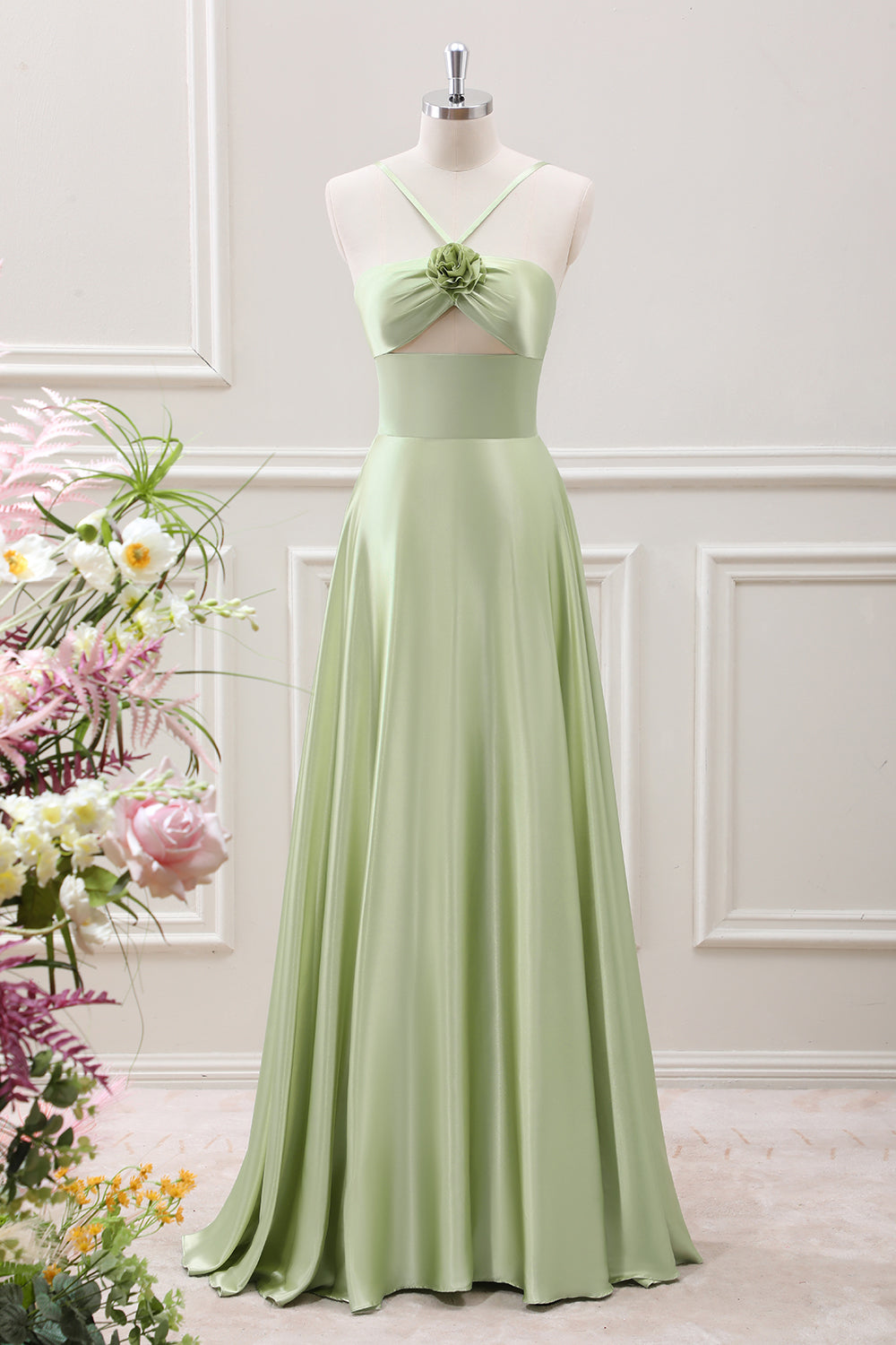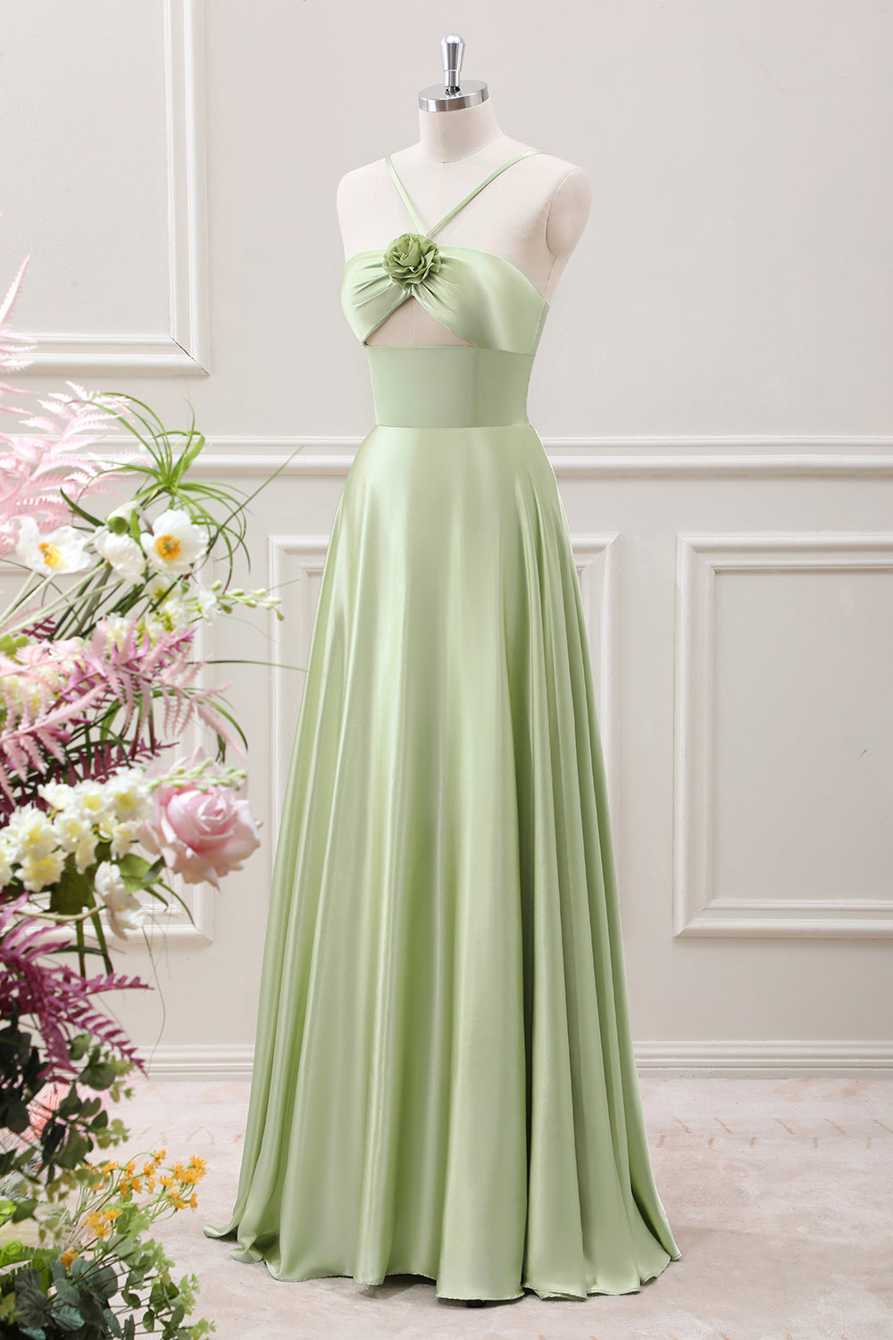 Light Green A-Line Halter Hollow Out Satin Maxi Dress with Flower