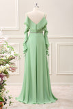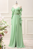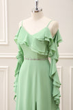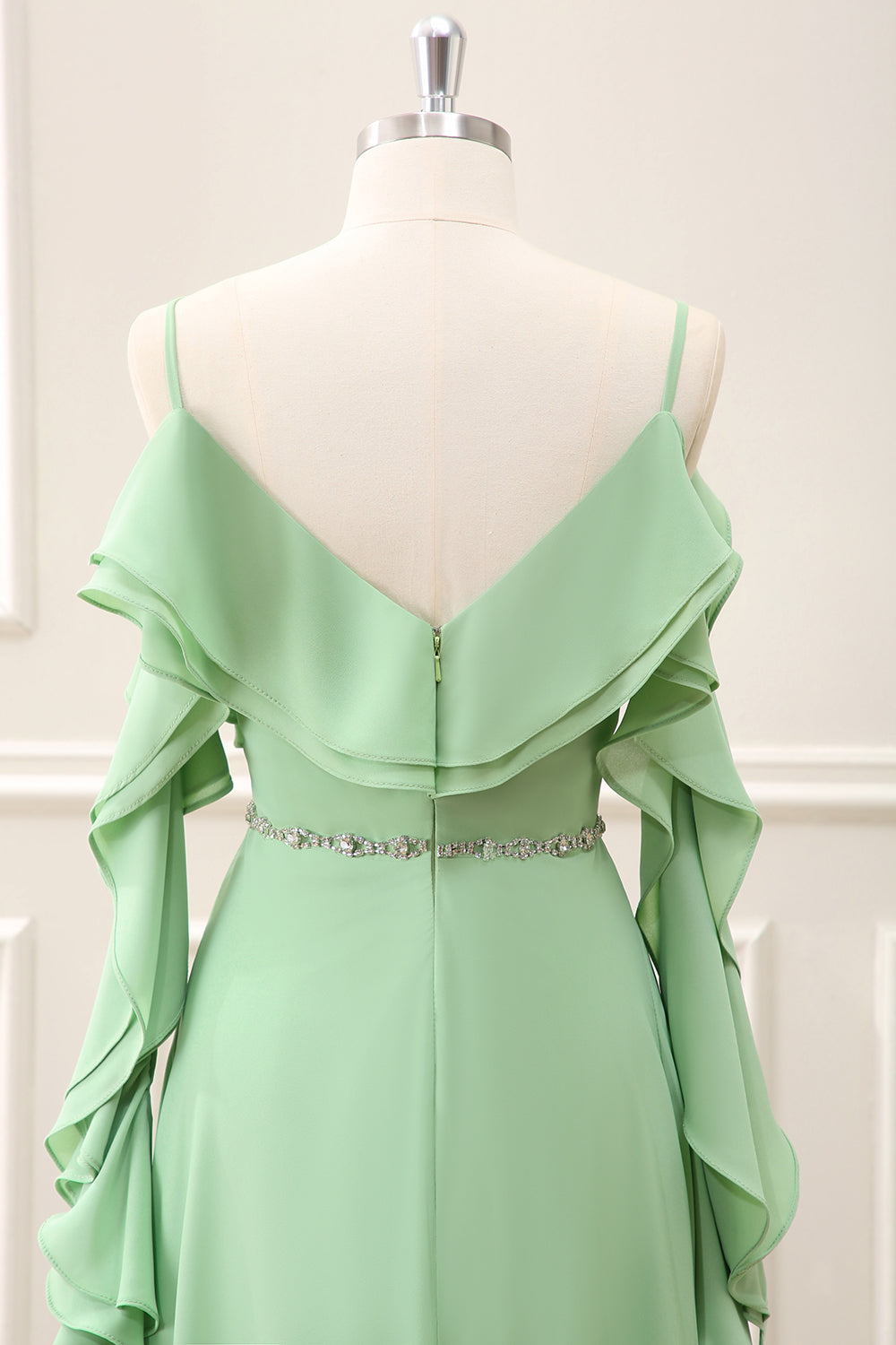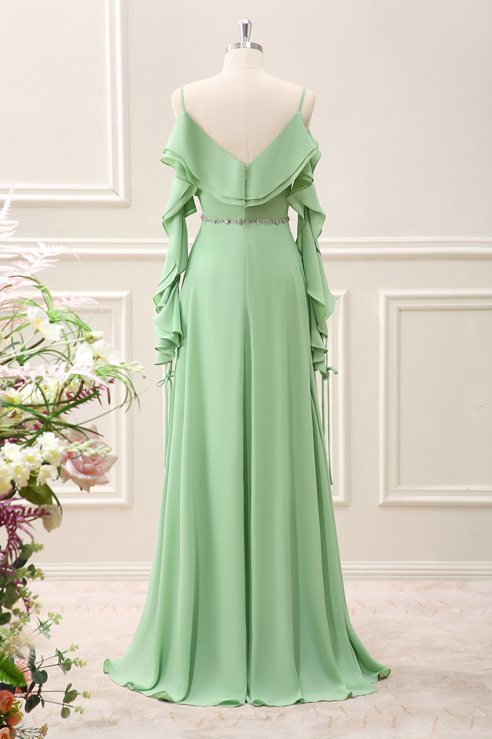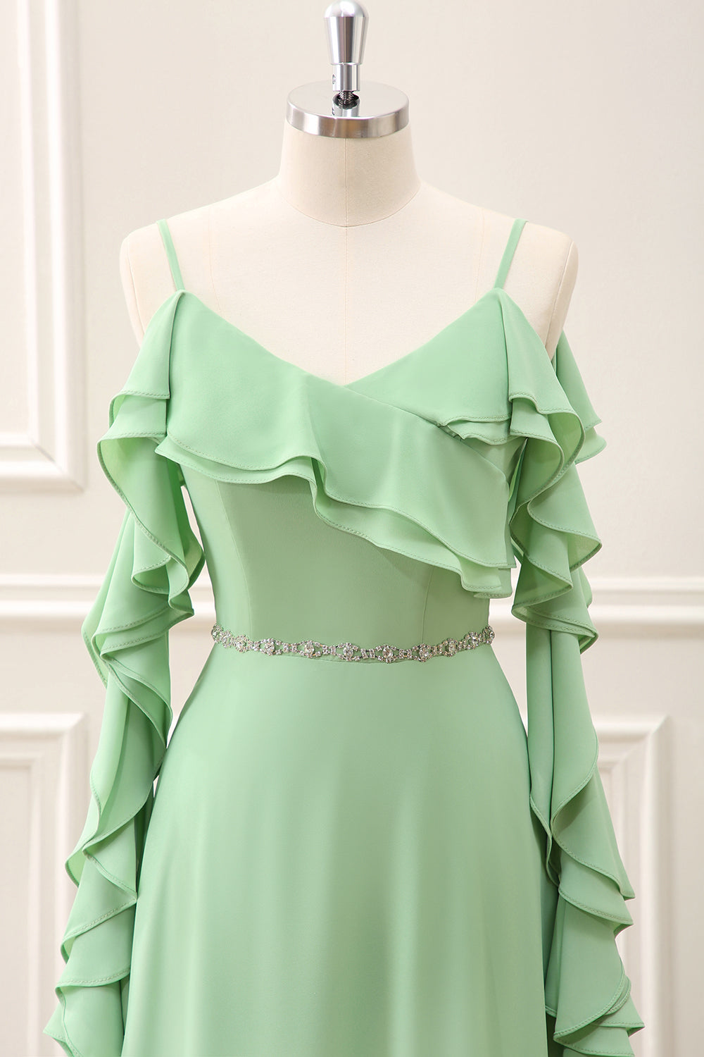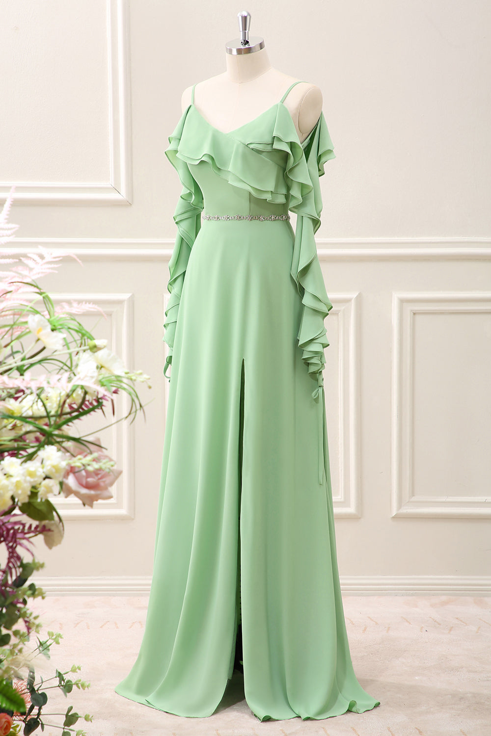 Light Green Cold Shoulder Chiffon Ruffled Maxi Dress with Slit