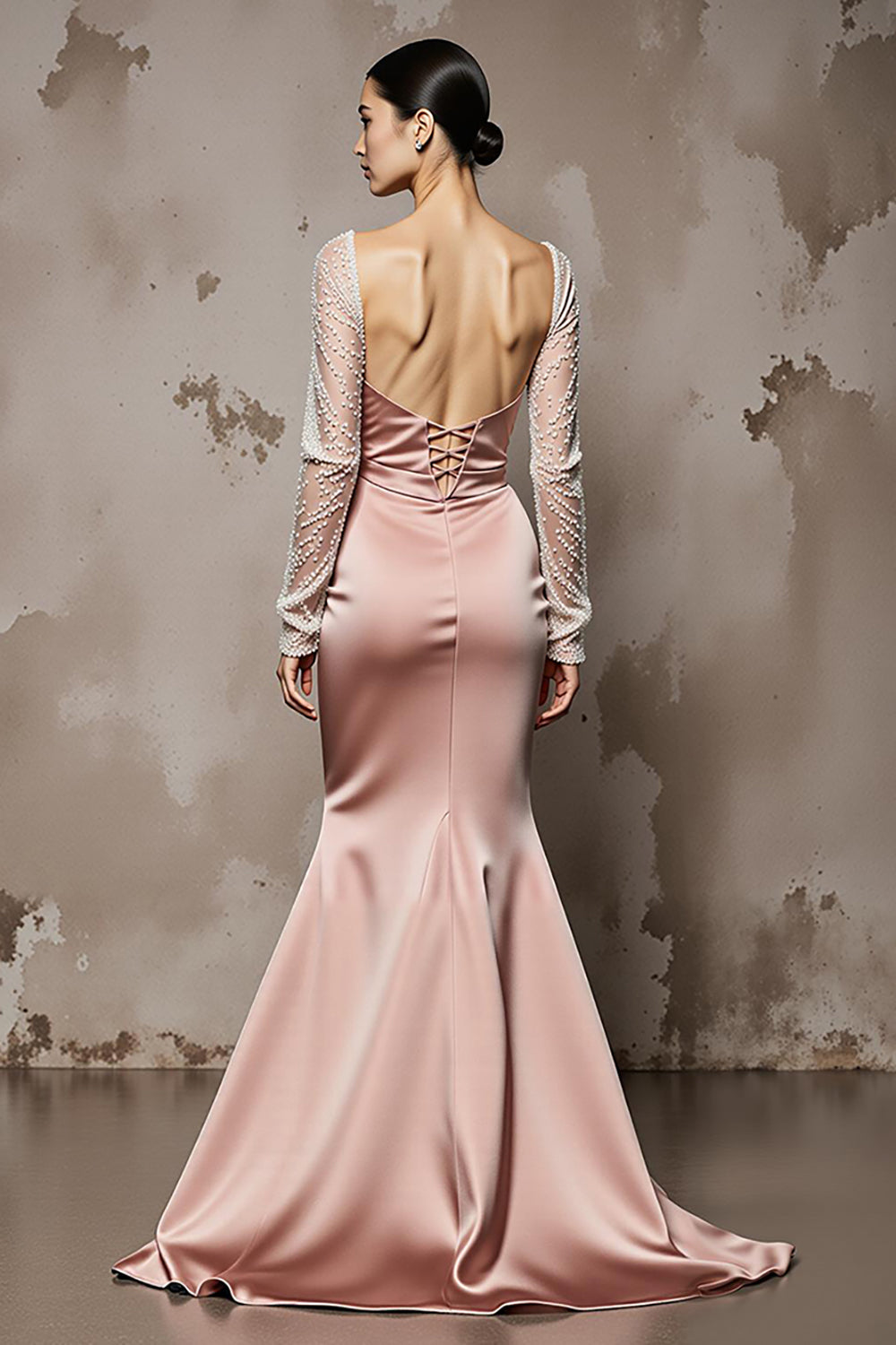 Light Pink Mermaid Beaded Long Sleeve Satin Evening Dress