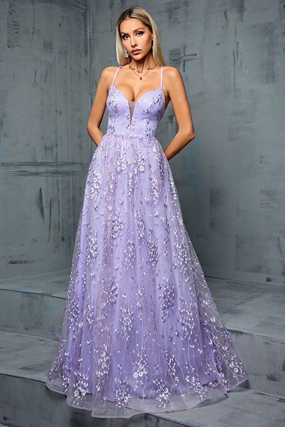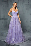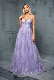 Lilac Appliques A Line V Neck Spaghetti Straps Tulle Maxi Dress