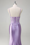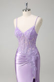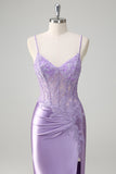 Lilac Corset Spaghetti Straps Mermaid Prom Dress with Appliques and Slit