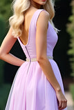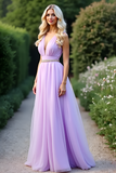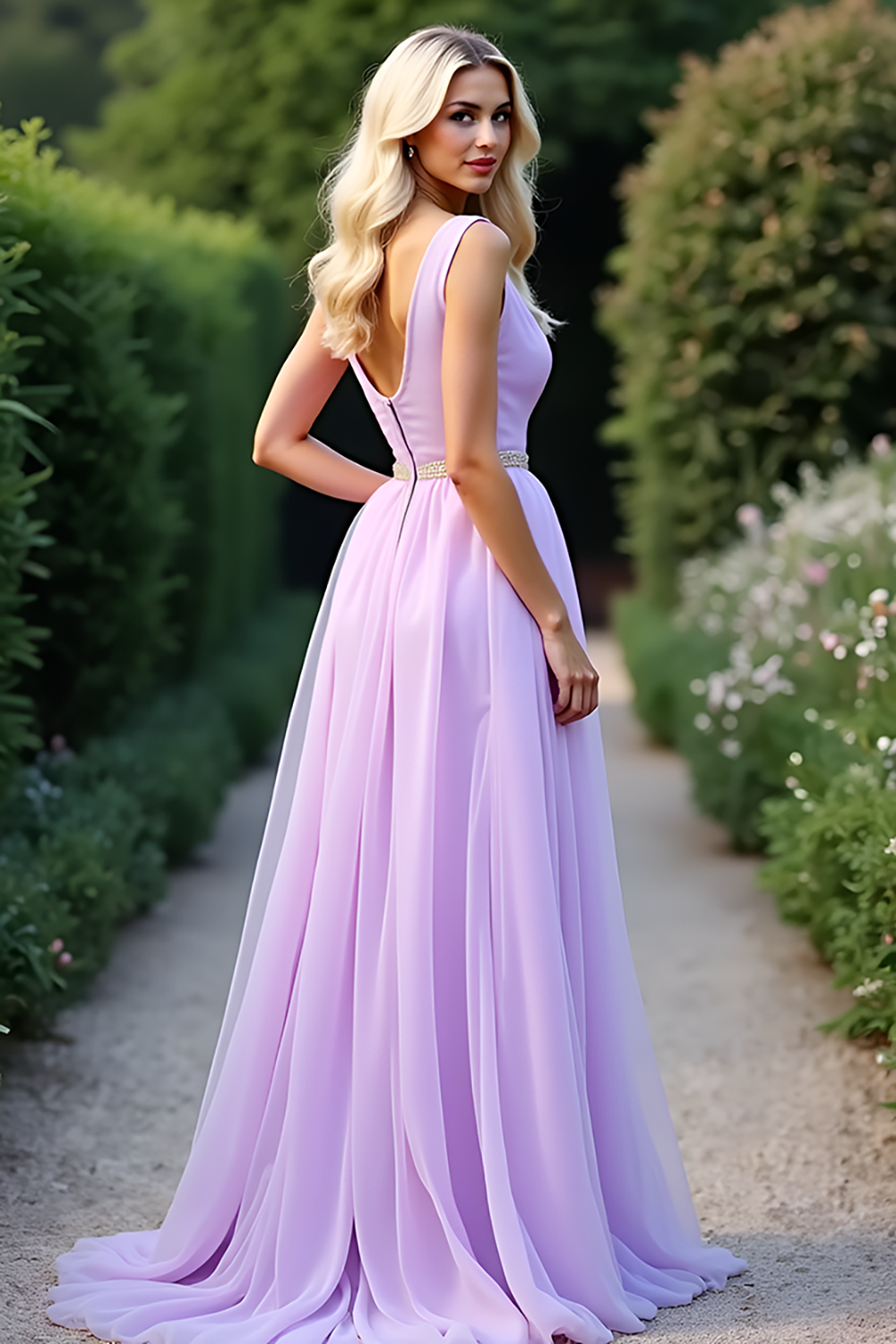 Lilac Organza A Line Beaded V Neck Prom Dress