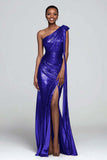 Metallic Ruched Brown One Shoulder Maxi Dress With Slit