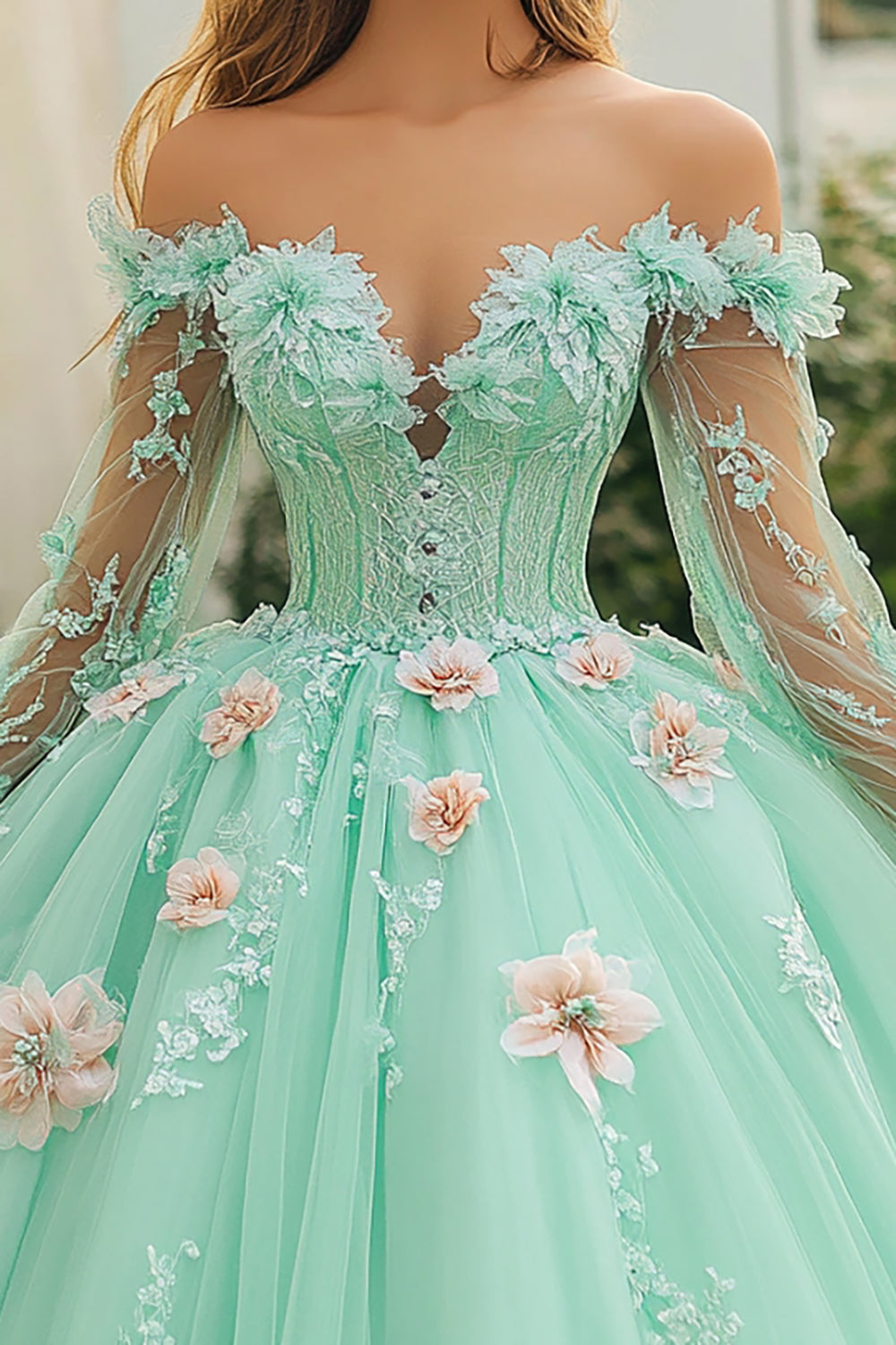 Mint Off The Shoulder Tulle Quinceanera Dress With 3D Flowers