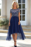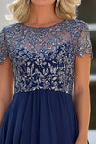 Navy Lace Tulle A Line Scoop Neck Short Sleeves Mother of the Bride Dress