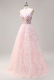 Pink Flower A Line Sequined Corset Prom Dress with Appliques