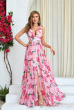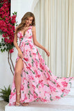 Pink Flower Print Pleated A Line Maxi Dress with Slit