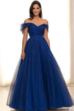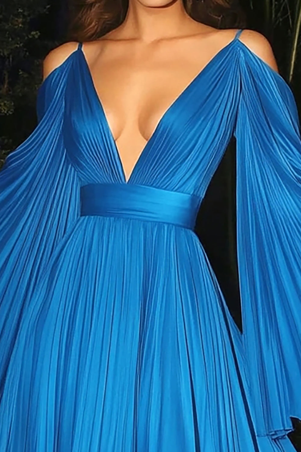 Pleated Blue V Neck A Line Gala Dress with Long Bell Sleeves