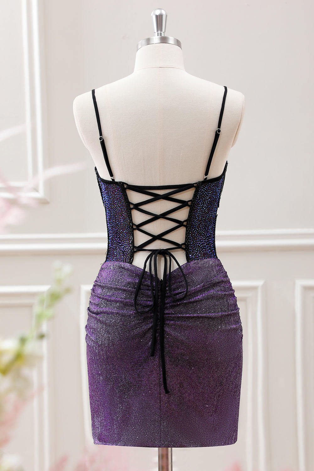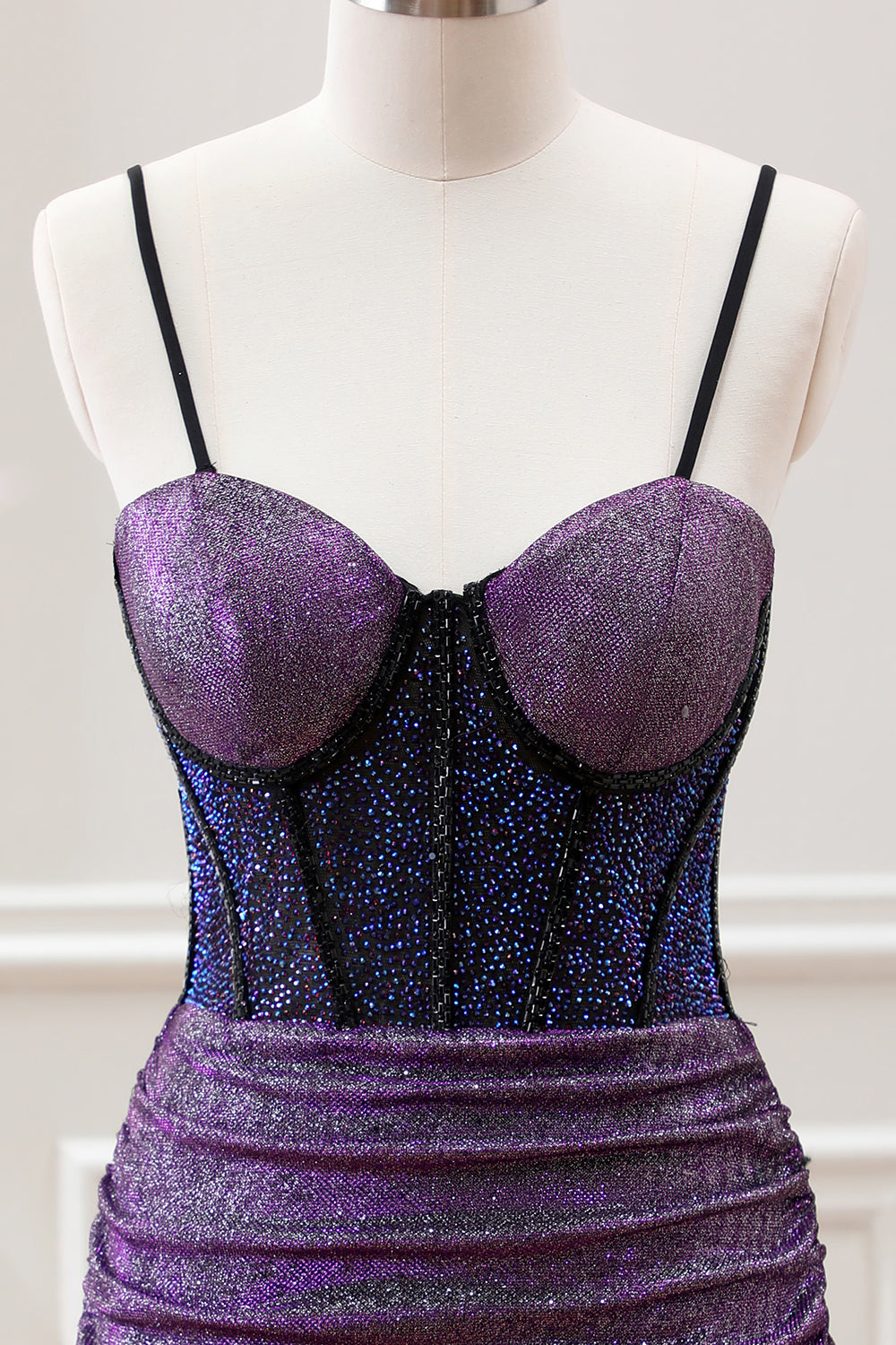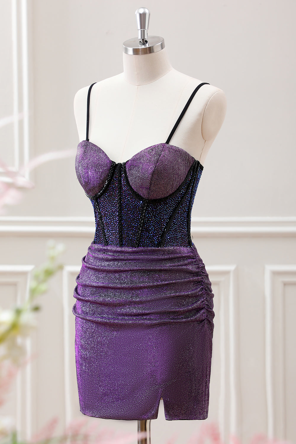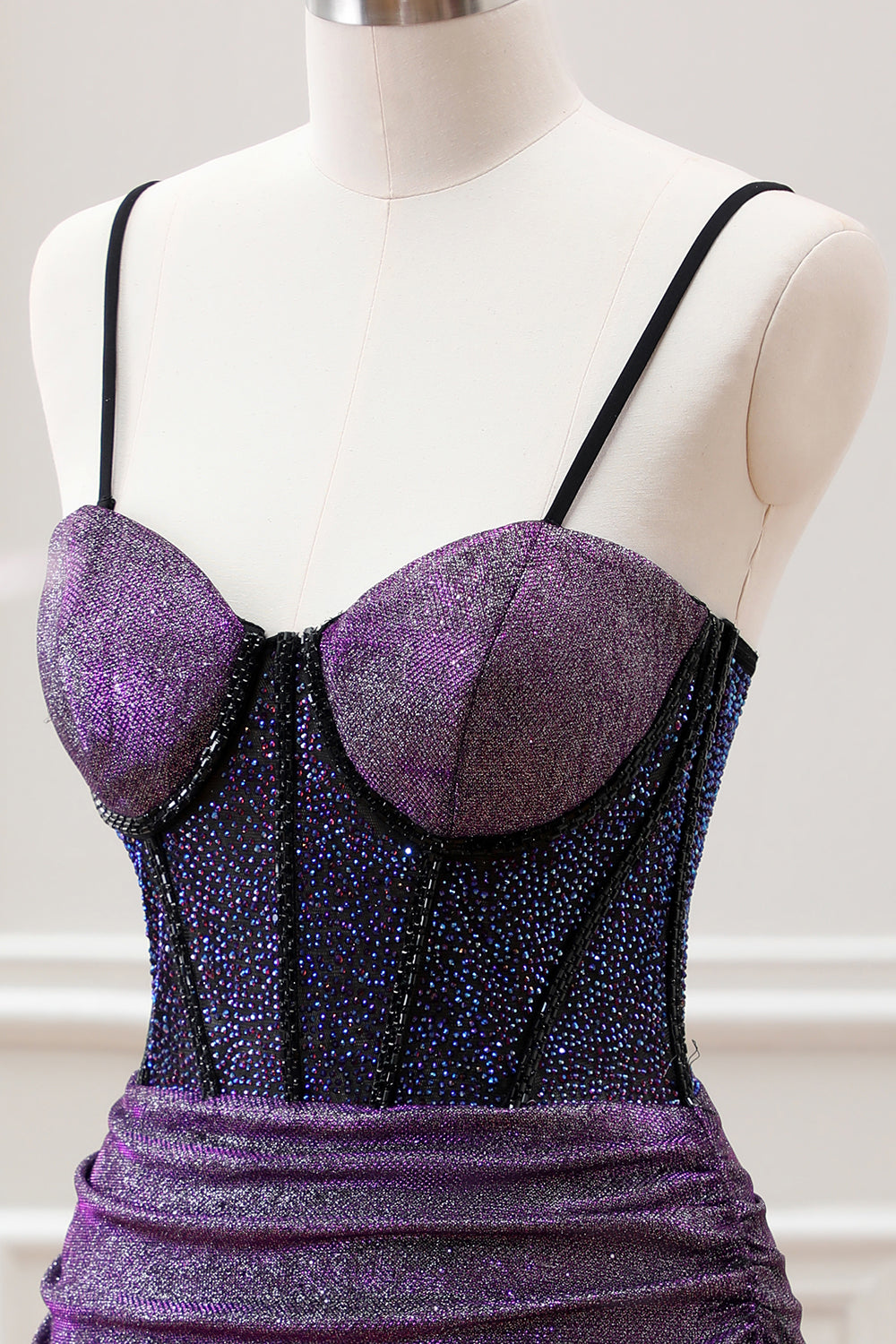 Purple Beaded Corset Pleated Bodycon Mini Dress with Slit