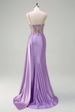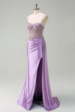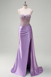 Purple Mermaid Satin Beaded Corset Prom Dress with Slit