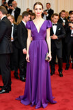 Purple Stretch Satin Deep V Neck A Line Gala Dress with Short Puff Sleeves