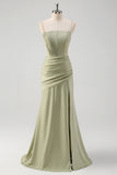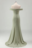 Sage Off the Shoulder Ruched Mermaid Maxi Prom Dress with Slit