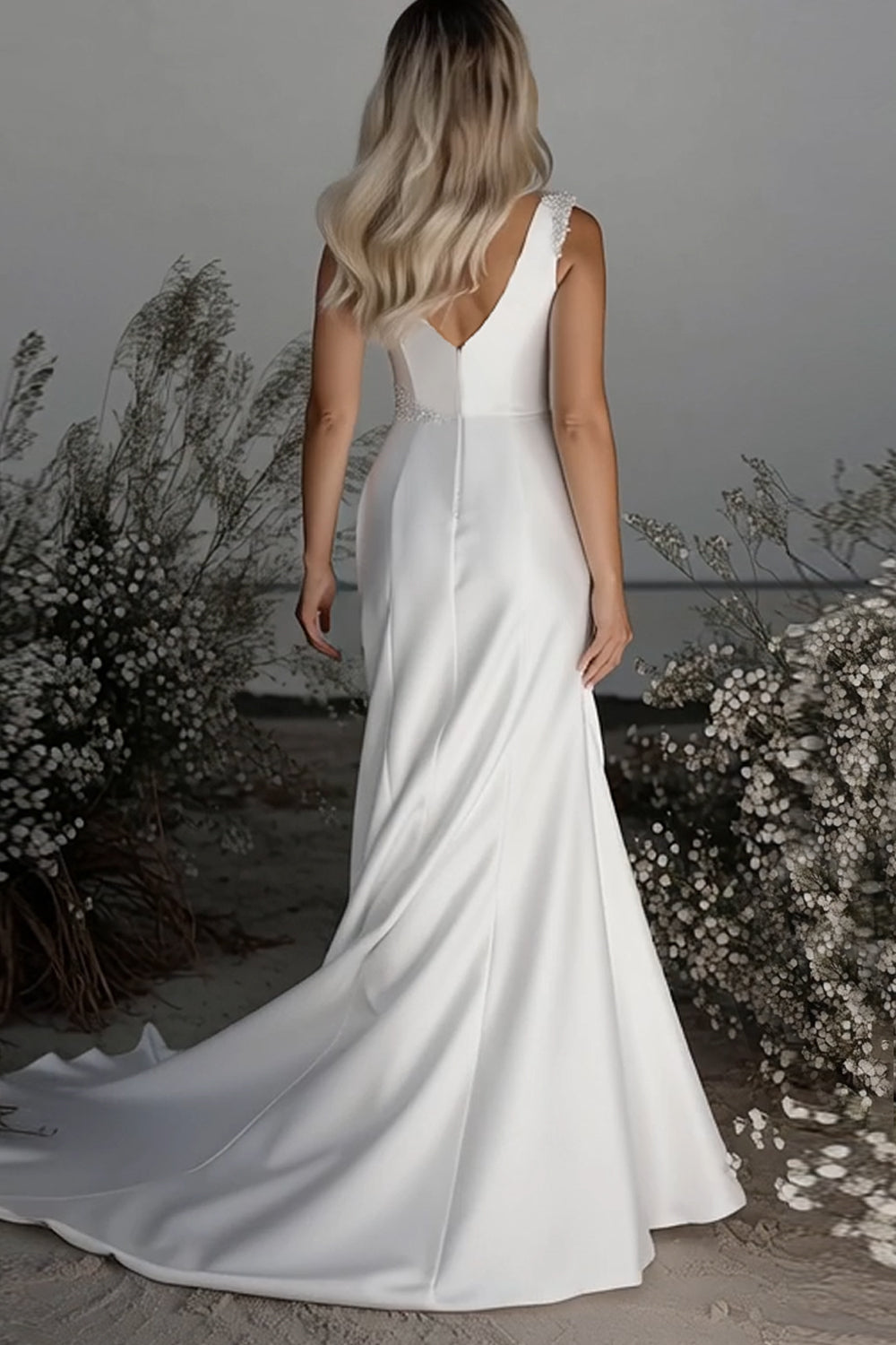 Simple Ivory Boat Neck Slit Satin Wedding Dress