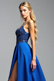 Spaghetti Straps Royal Blue A Line Beads Prom Dress with Slit