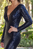 Sparkly Navy Sheath V Neck Long Sleeve Mother of the Bride Dress with Slit