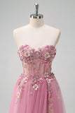 Taro A Line Corset Slit Strapless Prom Dress with Flower Appliques