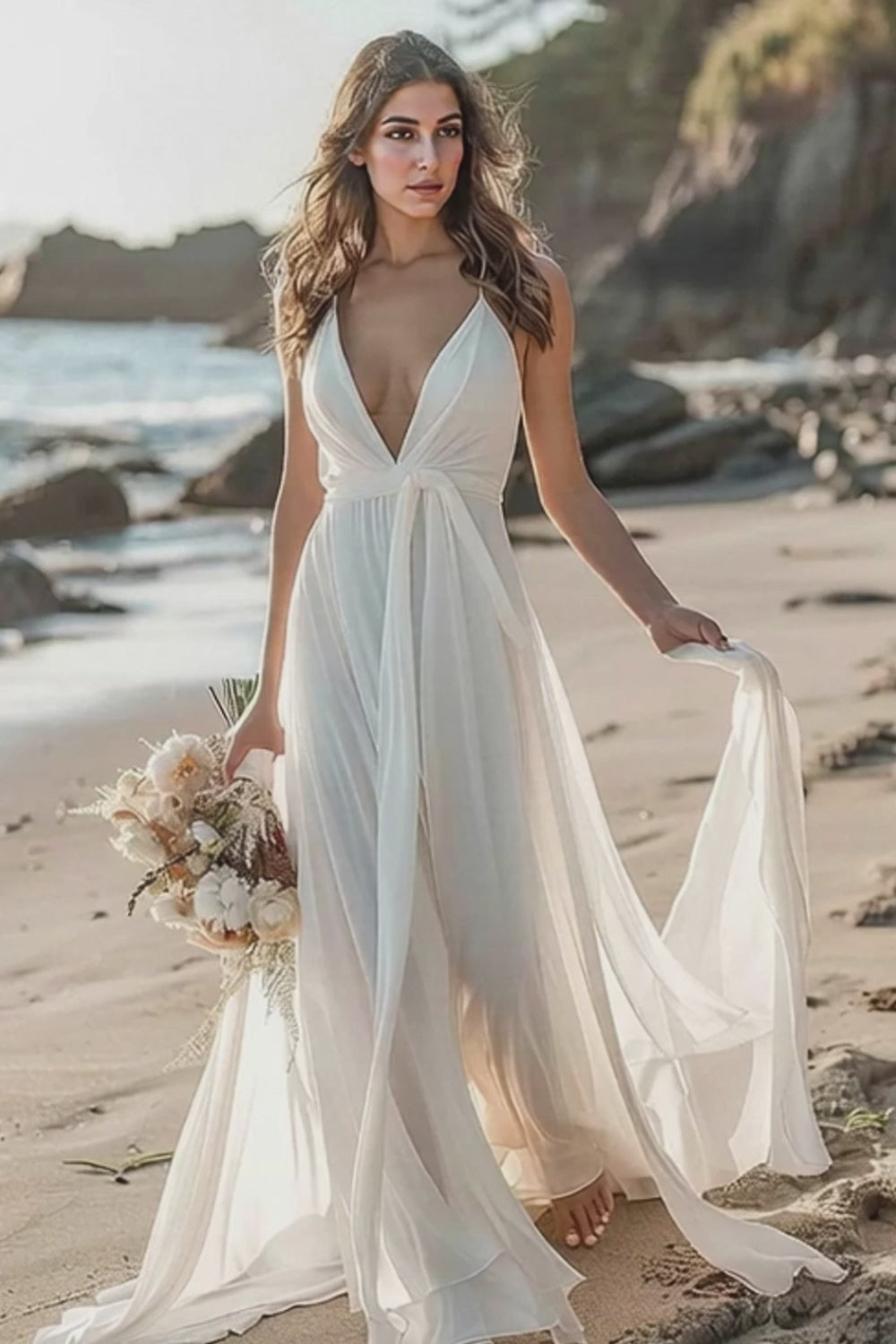 White Chiffon Spaghetti Straps Long Wedding Dress