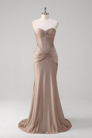 Glitter Khaki Ruched Corset Strapless Mermaid Floor Length Prom Dress