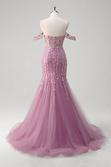 Fairy Pink Sequined Tulle Slit Prom Dress with 3D Appliques