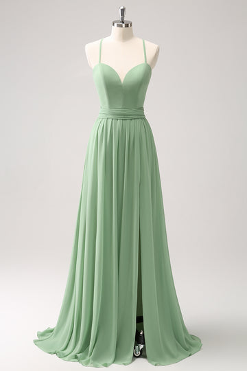 Dusty Sage Lace-up Back A Line Bridesmaid Dress with Slit