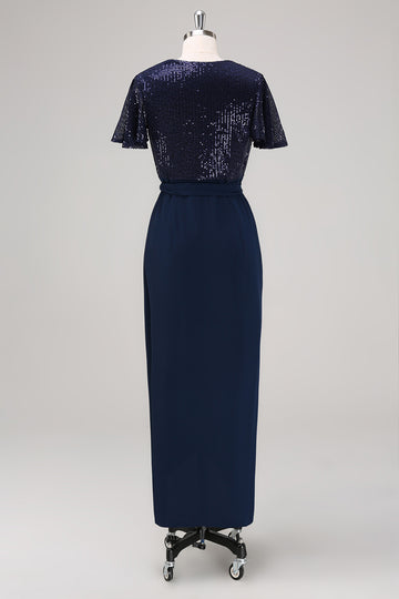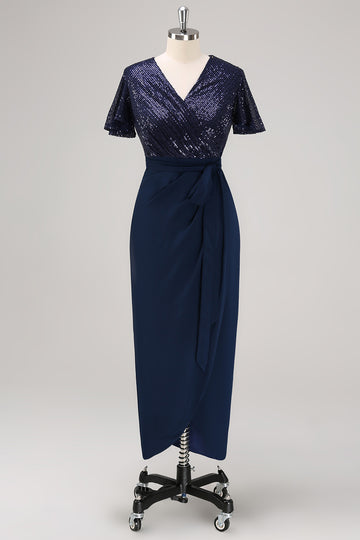 Sparkly Navy Sequined Ruched Wrap Dress with Short Sleeves