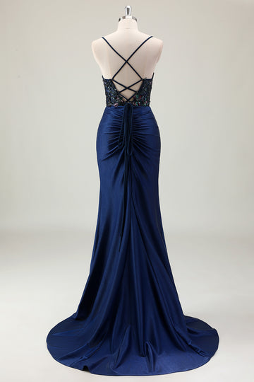 Dark Navy Ruched Mermaid Sequined Prom Dress with Slit