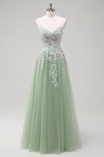 Sage A Line Tulle Applique Prom Dress with Lace-up Back