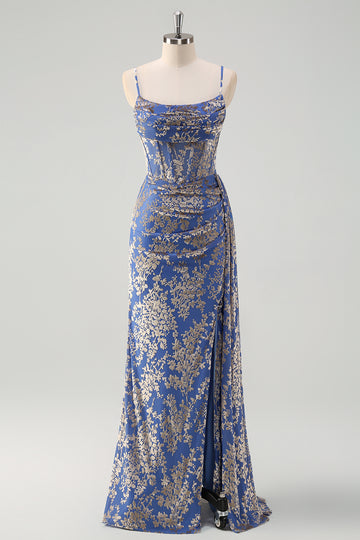 Sparkly Royal Blue Sweetheart Corset Prom Dress with Slit