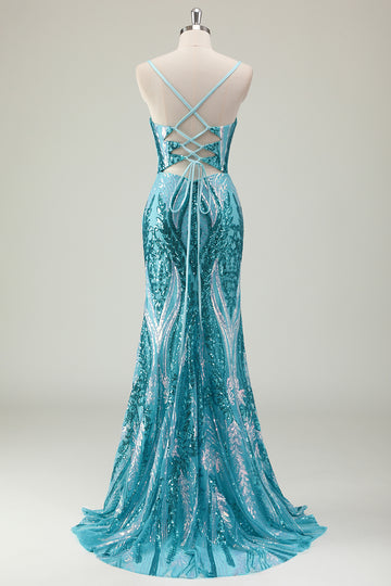 Sparkly Blue Hollow Out Mermaid Prom Dress with Slit