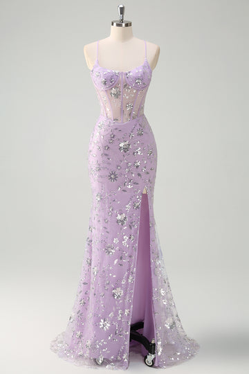 Sparkly Lilac Corset Mermaid Slit Prom Dress with Lace-up Back