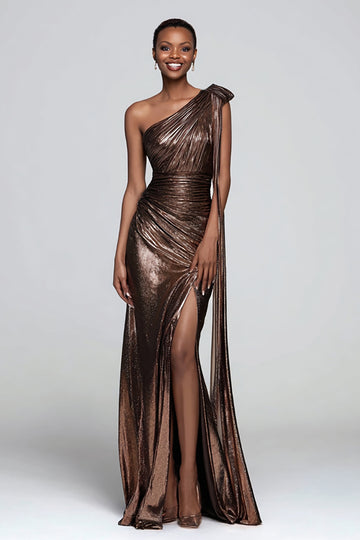 Metallic Brown One Shoulder Ruched Formal Dress With Slit