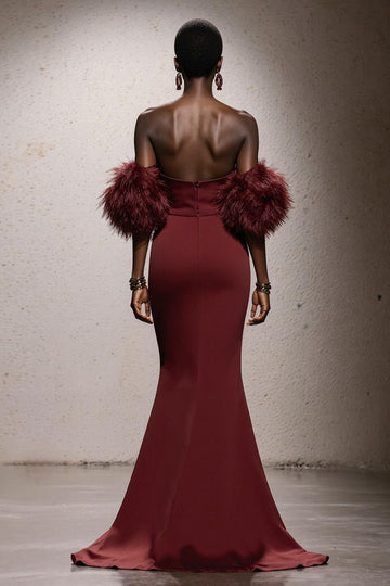 Burgundy Strapless Mermaid Maxi Gala Dress With Feathers