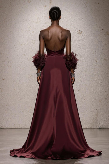 Burgundy A-Line Strapless Maxi Gala Dress (Without Feathers)
