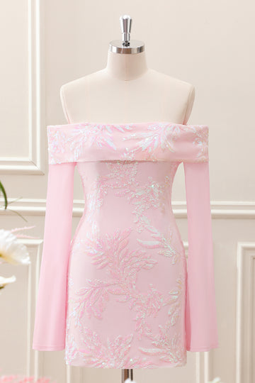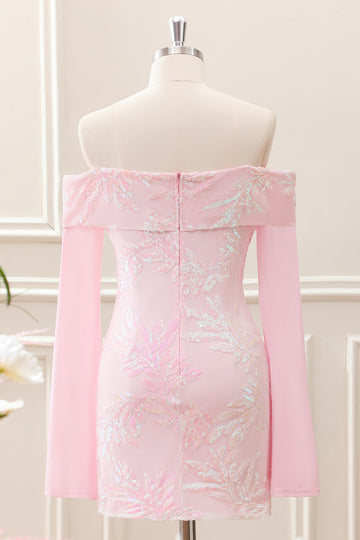 Sparkly Pink Off the Shoulder Sequined Tight Mini Dress with Long Sleeves