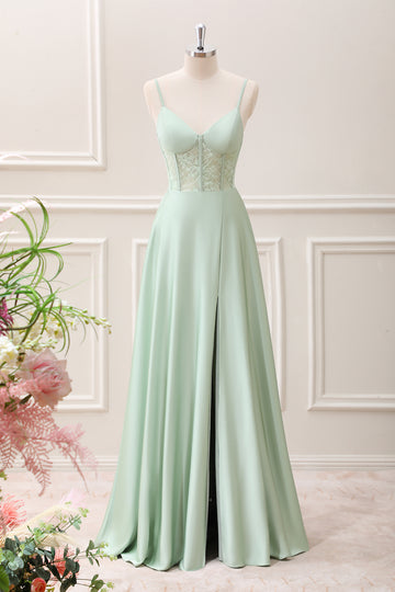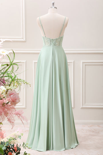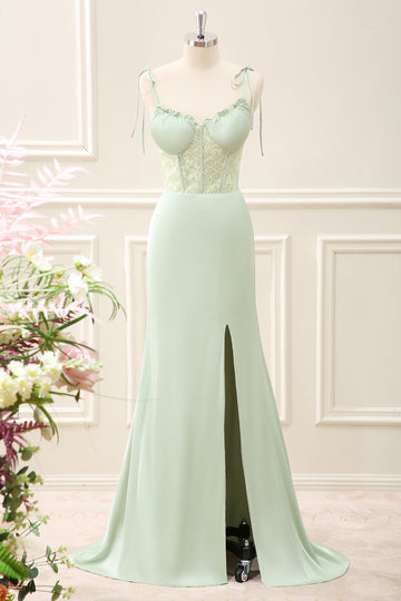 Green Corset Mermaid Embroidered Slit Maxi Dress with Lace up Back