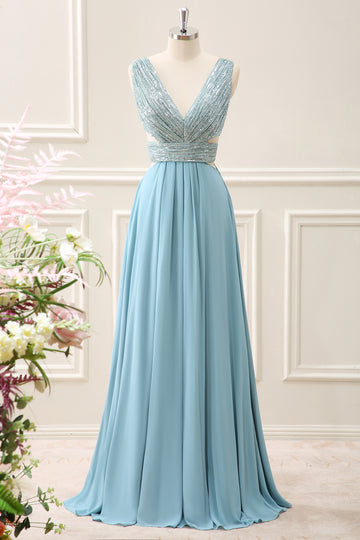 Sparkly Grey Green A Line V Neck Sequined Maxi Dress