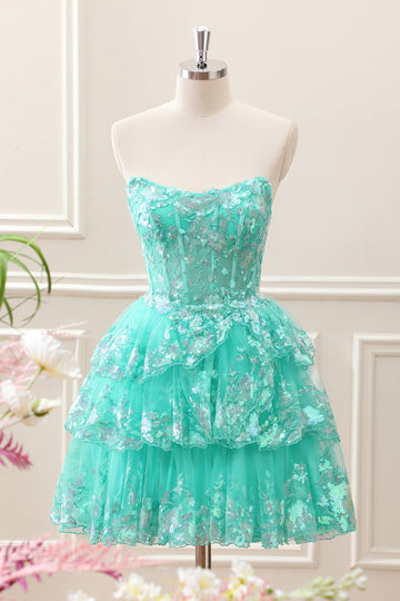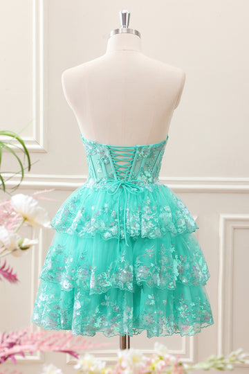 Sparkly Green A Line Sequined Corset Tiered Tulle Strapless Mini Dress