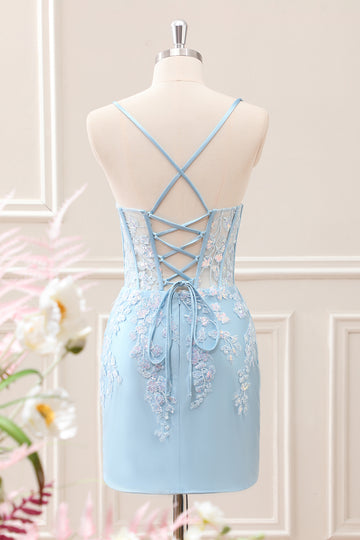 Glitter Blue Appliques Corset Satin Tight Mini Dress with Lace up Back