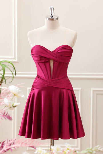 Burgundy Pleated A Line Corset Keyhole Strapless Mini Dress