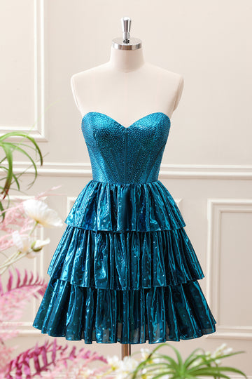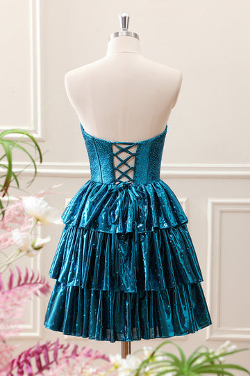 Unique Peacock Blue Strapless Tiered Pleated Corset A Line Mini Dress
