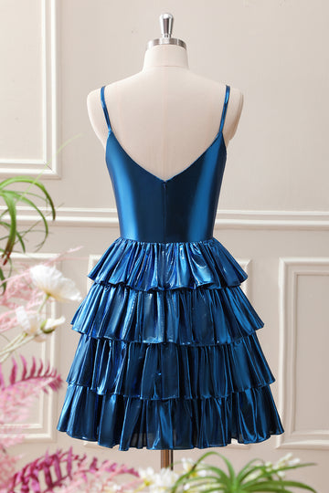 Glitter Ink Blue Spaghetti Straps A Line Tiered Mini Dress