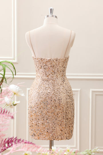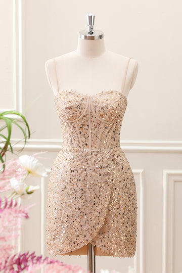 Sparkly Golden Sequined Corset Tight Spaghetti Straps Mini Dress