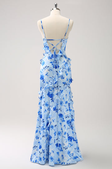 Blue Sheath Floral Ruffles Maxi Dress with Slit