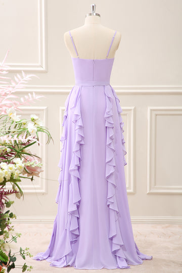 Lilac Spaghetti Straps Sheath Ruffles Bow Maxi Dress with Slit