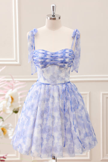 Flowy Print Blue A Line Pleated Mini Dress with Lace up Back