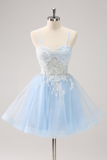 Elegant Blue Sequined A Line Corset Floral Appliques Mini Dress
